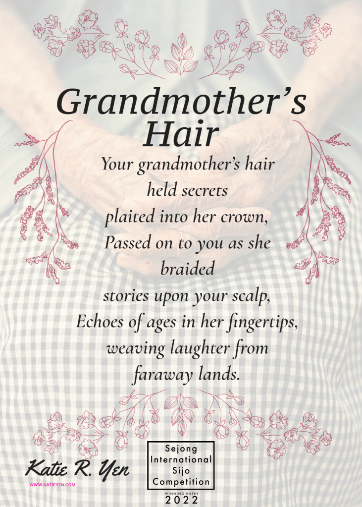 I’m ecstatic to share that my poem, Grandmother’s Hair, is the winning entry of the 2022 Sejong International Sijo Competition, hosted by The Sejong Cultural Society. Keep reading to be treated to this poem, which reaches across boundaries of borders and time.